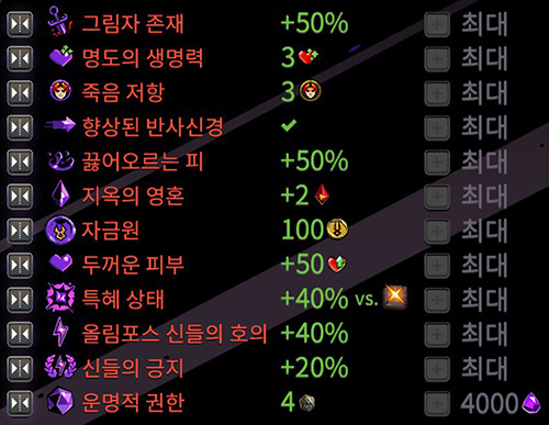 | 미다스의 손 | 지하세계 지역을 탈출할 때마다 각 단계 당 소지한 카론의 은화의 5%를 획득합니다. | 3 (+15%) | 70/ 90/ 110 (합계: 270) | 10개 |